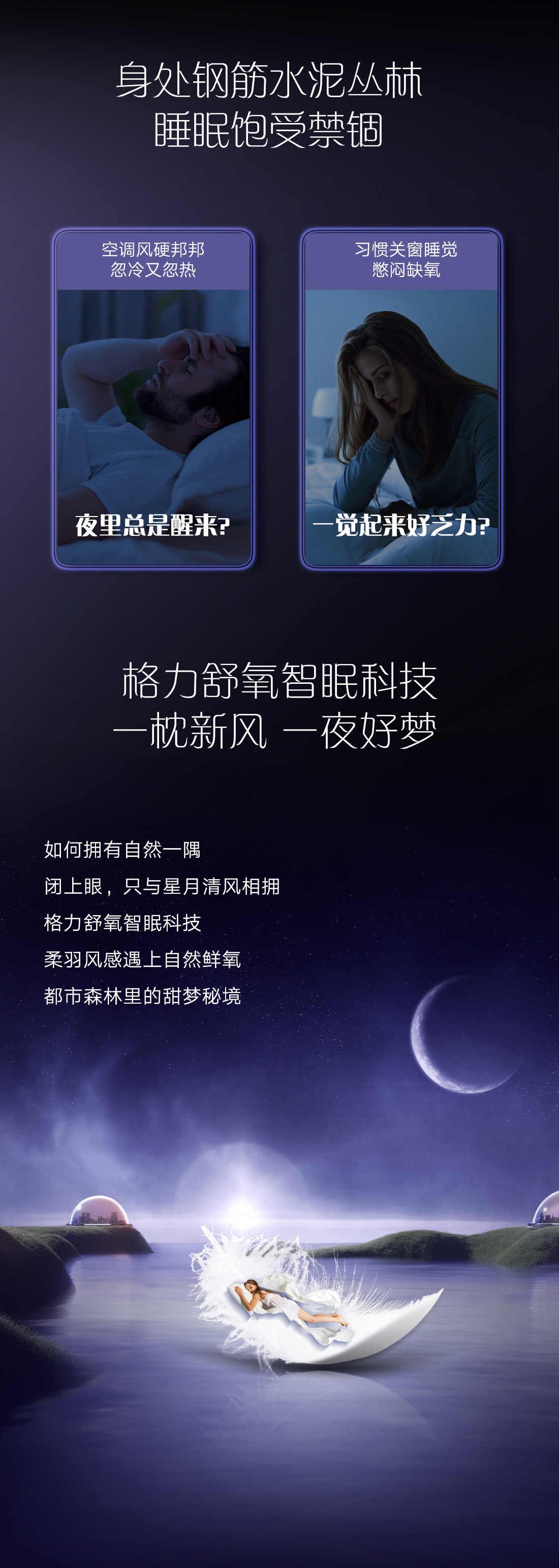 渾然天成,一個優(yōu)雅的治愈系。仿星緞布紋工藝,星光點點,織錦伴夢。舒氧智眠科技,柔羽風(fēng)感遇上自然鮮氧,臥室成為身心的棲居圣地。情緒回緩,一夢天光。